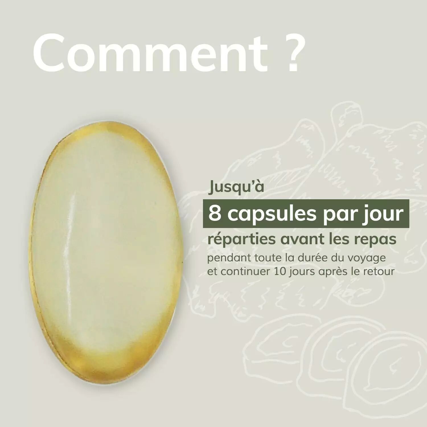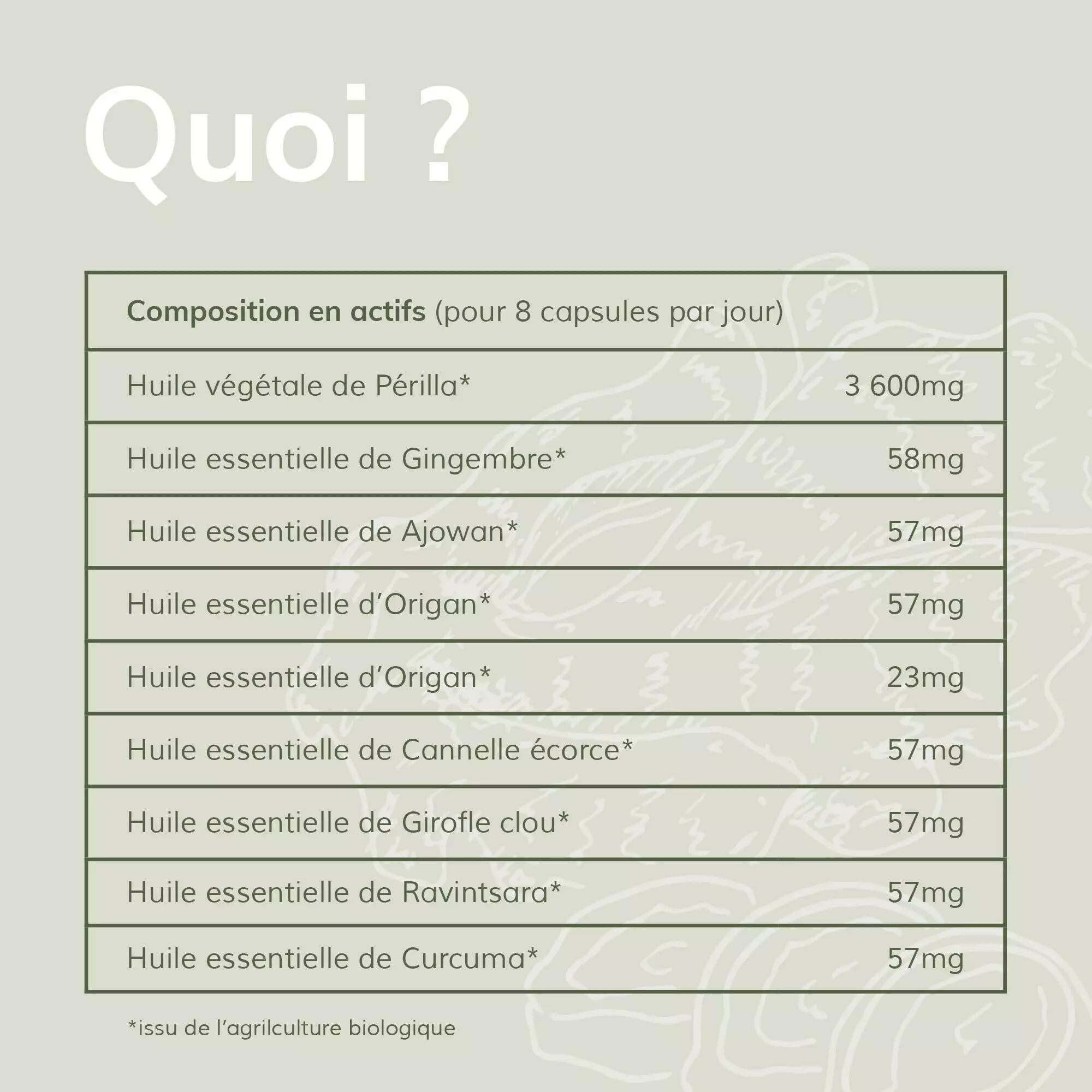 Ingrédients : Huile végétale de Perilla frutescens*, huiles essentielles* : Zingiber officinalis bio, Trachyspermum ammi bio, Origanum compactum bio, Cinnamomum zeylanicum bio, Eugenia caryophyllus bio, Cinnamomum camphora bio, Curcuma longa bio, enveloppe de gélatine*